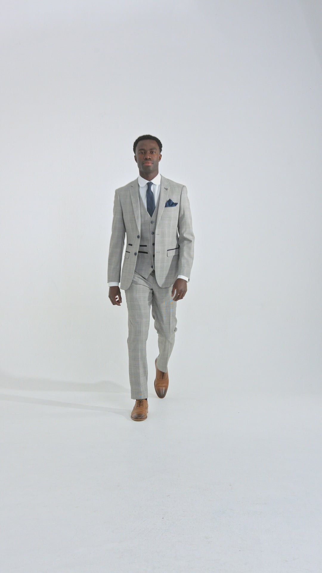 * Тъмносини кадифени кантове: За да добави нотка елегантност, костюмът има тъмносини кадифени кантове по джобовете, осигуряващи луксозен контраст със сивия плат.